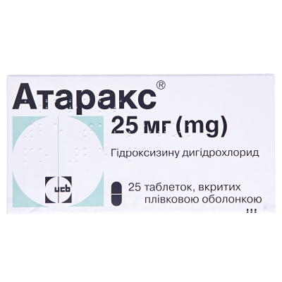 Дозування 25 мг. В упаковці 25 таблеток. Виробник UCB Farma, Бельгія … Склад: діюча речовина: hydroxyzine;. 1 таблетка містить гідроксизину гідро хлориду 25 мг;.