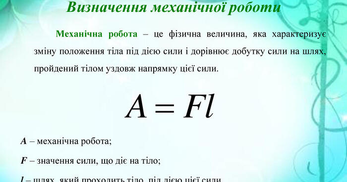Механічна робота — це фізична величина, яка характеризує зміну стану тіла під дією сили і дорівнює добутку сили на шлях, пройдений тілом у напрямку цієї сили:.
