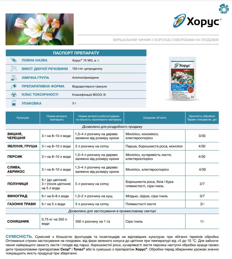 Інструкція із застосування Хорусу Яблуня та груша: 2–3 г на 10 л води.