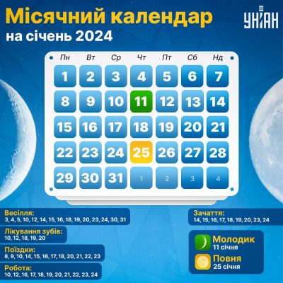 Фази Місяця в січні 2024 року. Спадний місяць: 1-10 і 26-31 січня;; Молодик: 11 січня;; Зростаючий: 12-24 січня;; Повний Місяць: 25 січня.