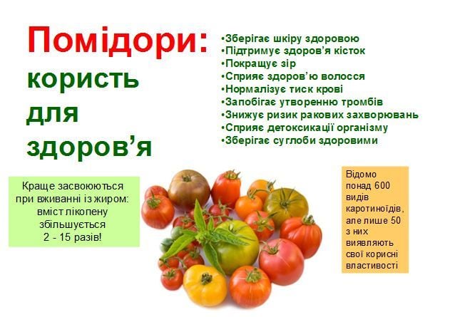 Томати лікують гіпертонію, покращують травлення, захищають від раку. Помідори корисні в будь-якому вигляді: у вигляді томатного соку, в вигляді кетчупу. У м'якоті плодів томатів присутні харчові волокна і рослинний білок, не кажучи вже по цінні органічні сполуки, назви яких важко вимовити і запам'ятати.’);}],[{id:’M01zaJeDHNeBi-gPrajhuQ4__69′},function(){window.jsl.dh(‘M01zaJeDHNeBi-gPrajhuQ4__69′,’
