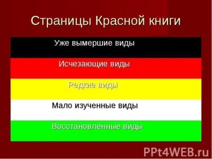 Якого кольори сторінки має Червона книга? Відповідь: Червоні – зниклі види; білі – друкуються рідкісні види; жовті – види, що скорочуються; …