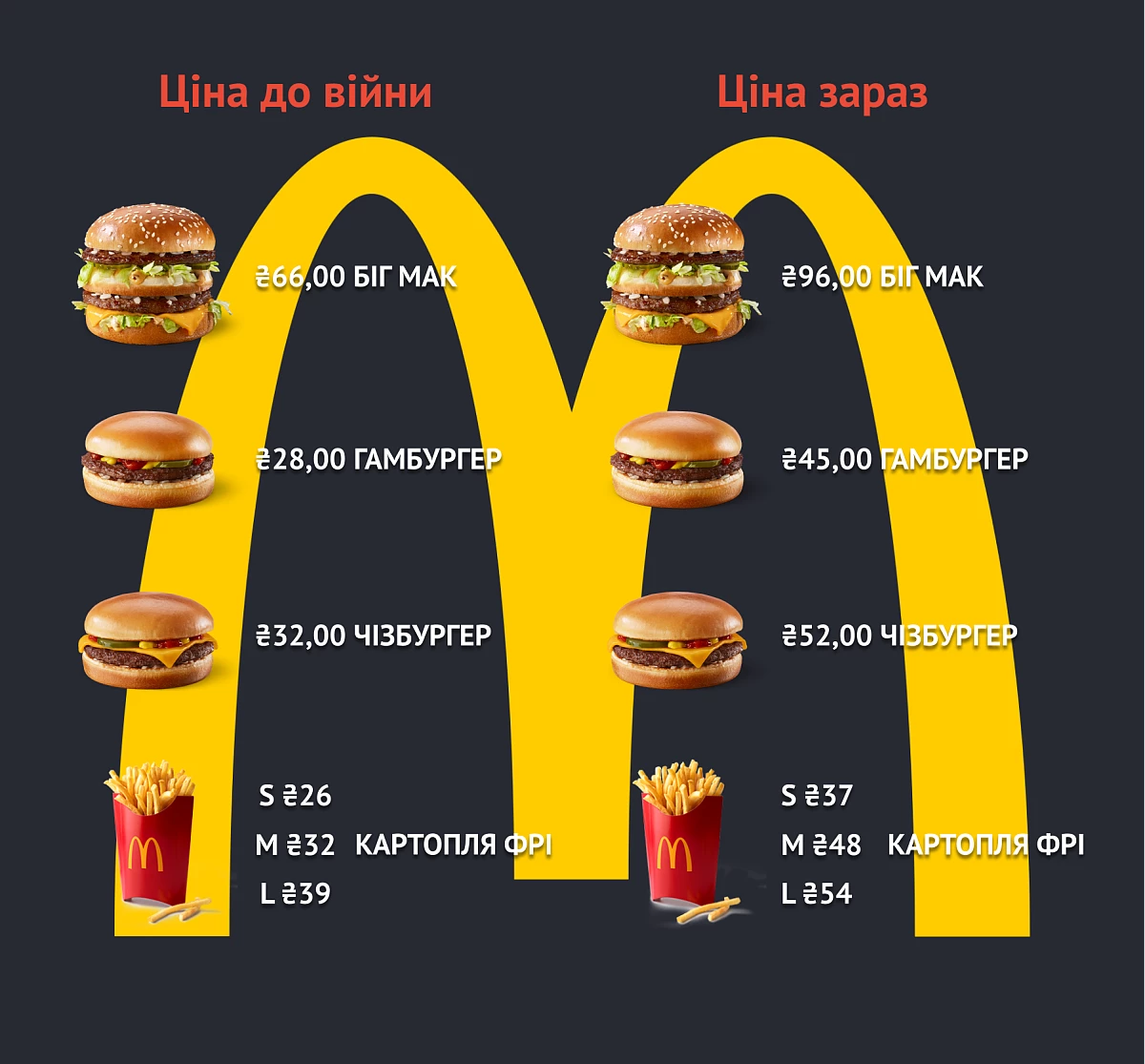 Зазначається, що Біг Мак 2022 року коштував 92 гривні, а 2025-го його ціна підскочила до 129 гривень, Чізбургер подорожчав із 52 до 67 грн, Гамбургер – із 45 грн до 58 грн, а 6 штук наггетсів – із 71 до 92 грн.