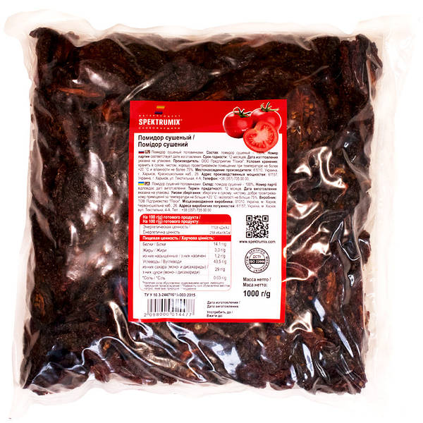 Томат сушений є дуже корисним овочем, оскільки в його складі присутні вуглеводи, клітковина, вітаміни(групи В, А, Е, С, РР, К, Н), мікро і макроелементи.