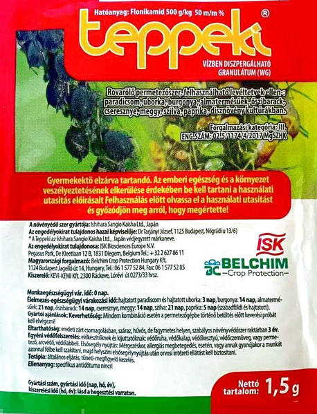Інструкція, спосіб застосування, склад, дозування та норма витрати інсектициду Teppeki Белчим Діюча речовина: флонікамід, 500 г/кг. Для приготування робочого розчину необхідно розчинити вміст упаковки 3 г у 6-10 літрів води та ретельно перемішати.