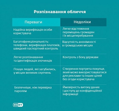 Високий рівень безпеки. Біометричні дані кожної людини є унікальними, що мінімізує кількість помилок у розпізнаванні. Постійний доступ. На відміну від цифрового логіна та паролю, біометричні дані неможливо забути або втратити.
