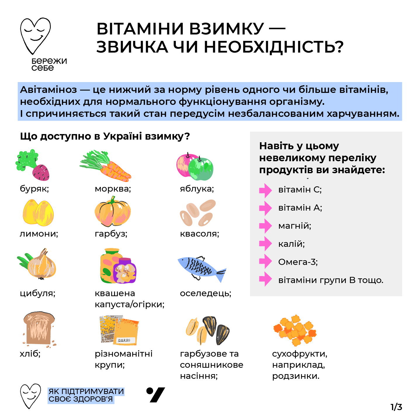 Наприклад: Втома та слабкість: може вказувати на дефіцит вітаміну D та вітамінів групи B. Взимку це особливо актуально через менше перебування на сонці. Сухість шкіри та проблеми з волоссям: можуть бути ознакою дефіциту вітамінів А, Е та біотину.