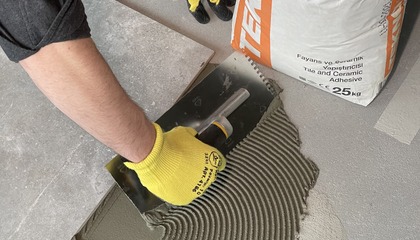 Керамограніт краще укладати при кімнатній температурі (від +10 до +30 °С). Клей наносять як на основу, так і на саму плитку (тоншим шаром). Розчин спочатку розрівнюють прямим, а потім зубчастим шпателем, нахиленим під кутом 45°. Рекомендована висота борозен клею на основі – 4-5 мм.
