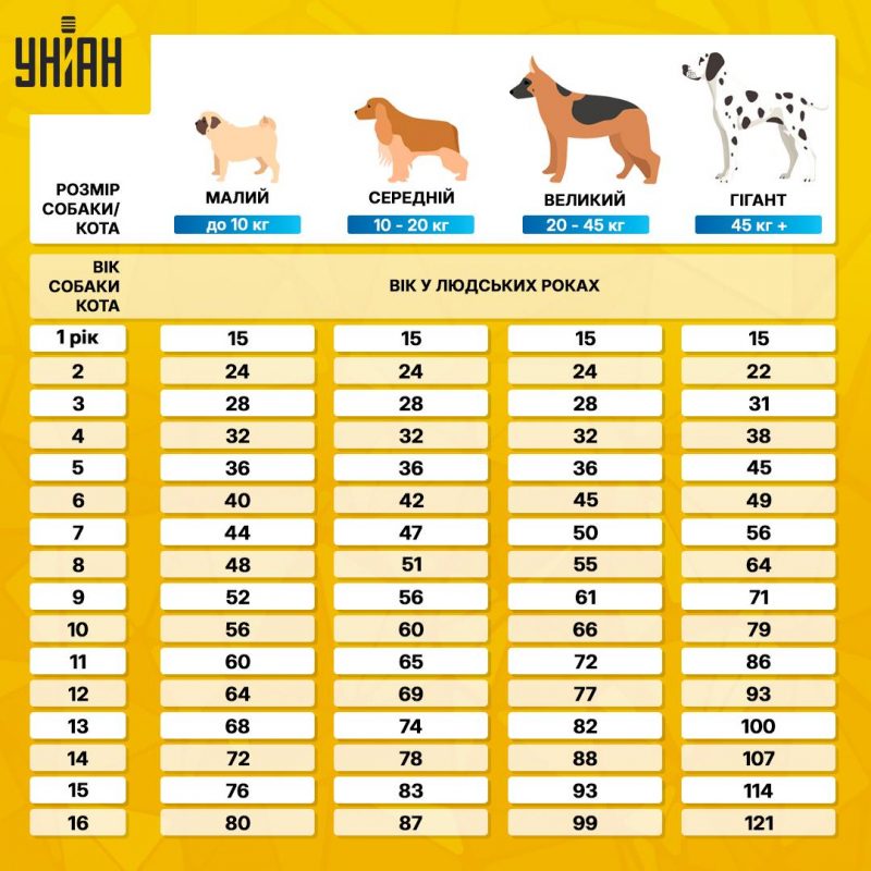 Найпопулярніший метод підрахунку. Суть методу "Сім до одного" полягає в тому, що перший рік життя собаки прирівнюється до семи людських років, а кожен наступний рік множиться на сім. Таким чином, якщо собаці 2 роки, то його вік в еквіваленті до людського становить приблизно 2*7=14 років.