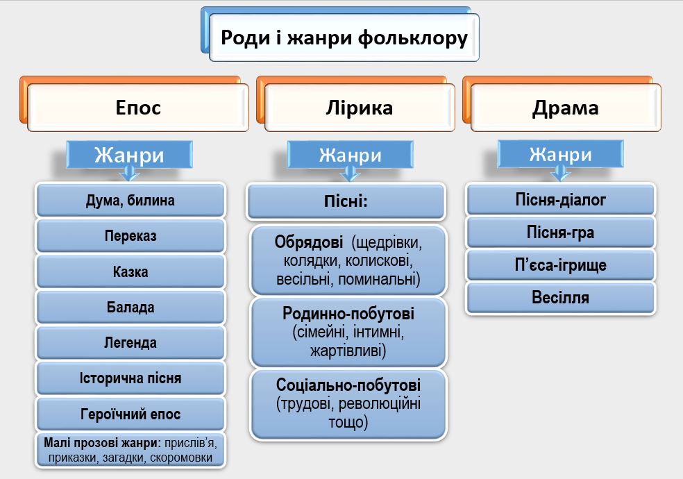 | ліричний вірш, пісня, елегія, епіграма, епітафія, елогій та інші | трагедія, комедія, драма, водевіль, фарс та інші | епопея, казка, байка, легенда, оповідання, повість, роман, новела, новелета, художні мемуари та інші |
